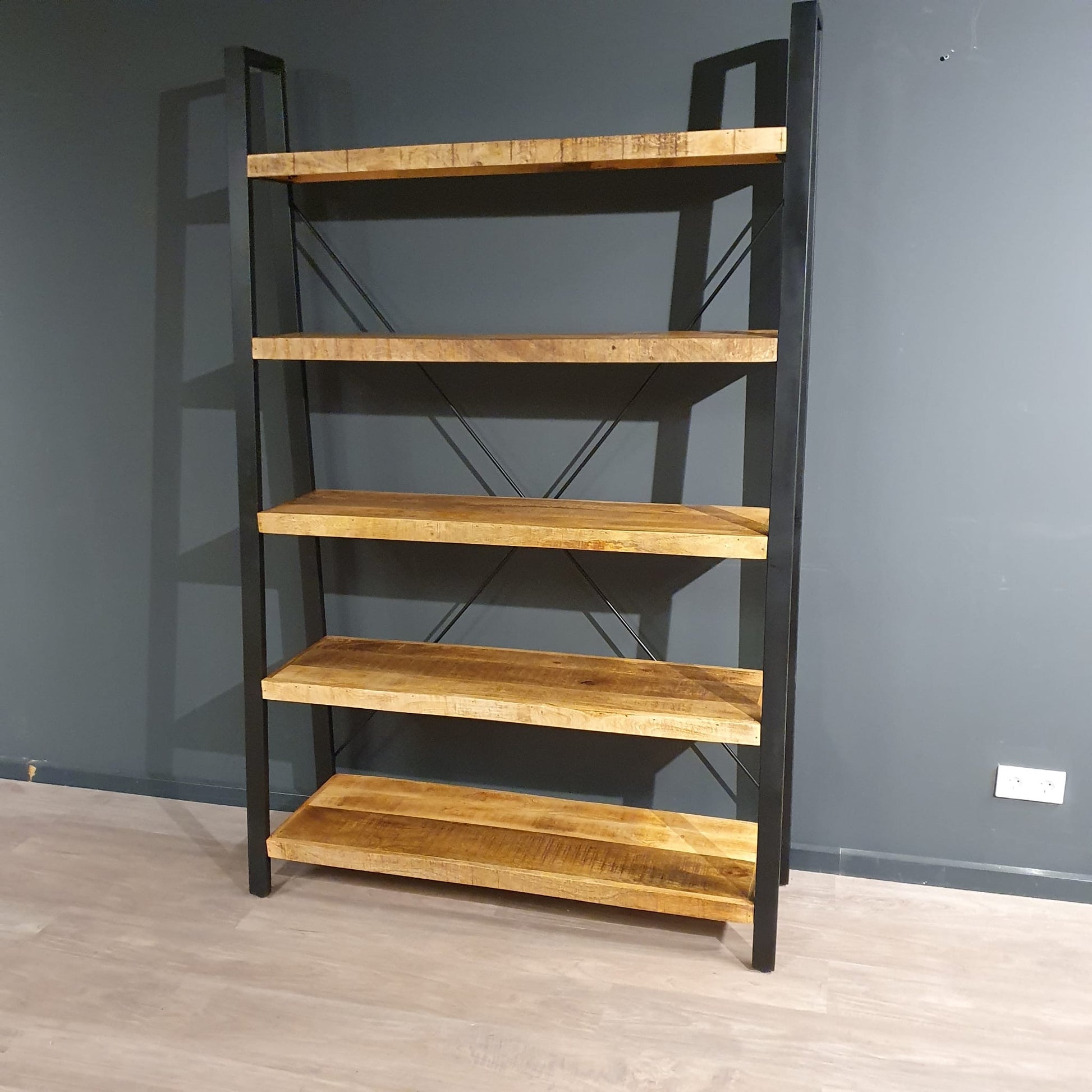 Industriële mangohouten boekenkast Nikki met schuine voorkant 130x40x200cm